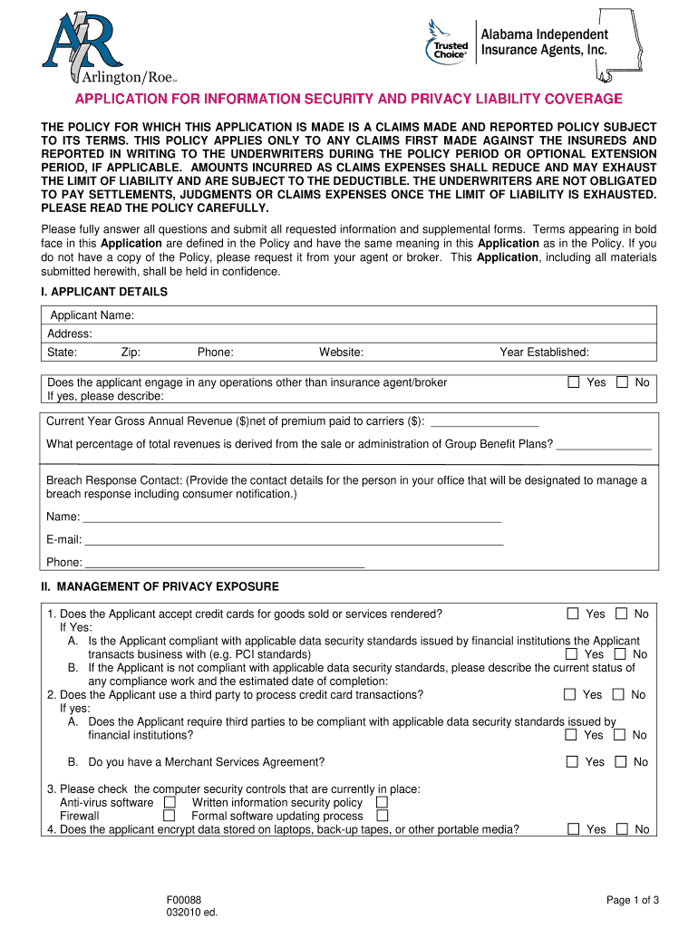 APPLICATION FOR INFORMATION SECURITY AND PRIVACY LIABILITY COVERAGE