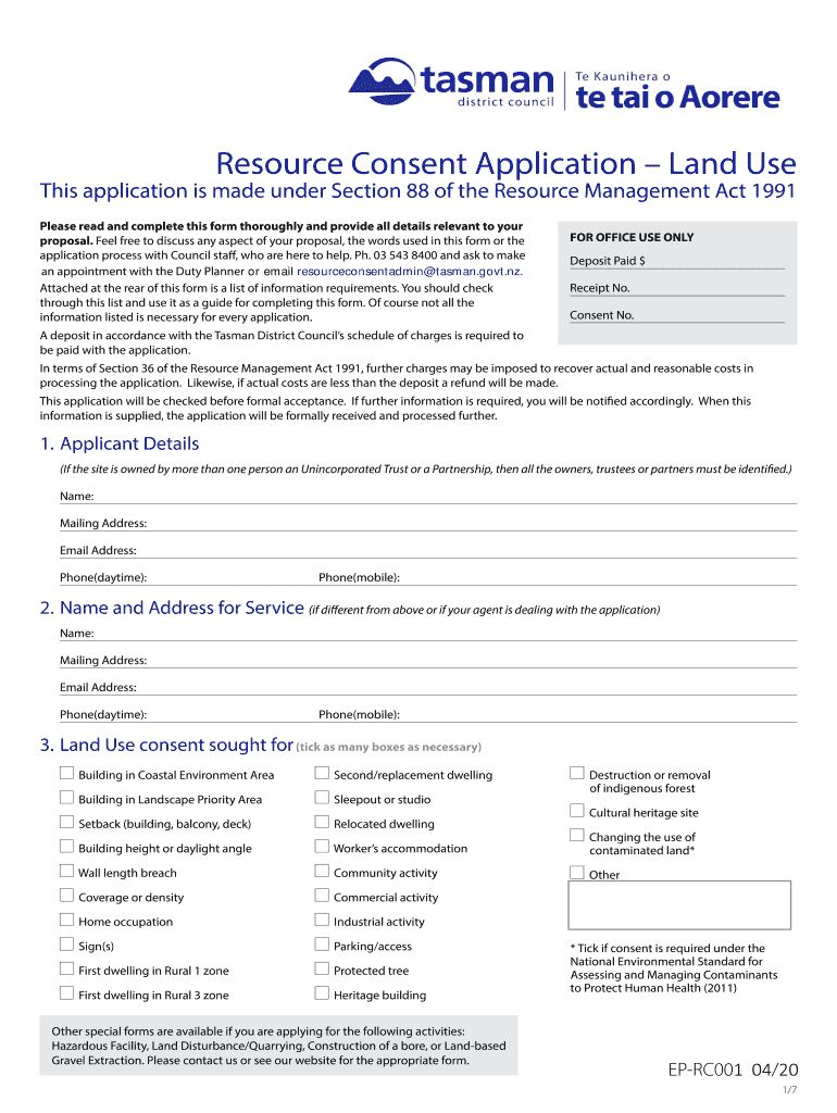 Resource Consent Application Land This application is made under Section 88 of the Resource Management Act 1991 Please read and complete this form thoroughly and provide all details relevant to your