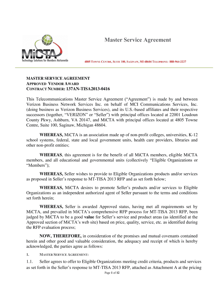 Master Service Agreement4805 TOWN Center, SUITE 100, SAGINAW, MI 48604 TELEPHONE: 8889642227MASTER SERVICE AGREEMENTAPPROVED VENDOR AWARD