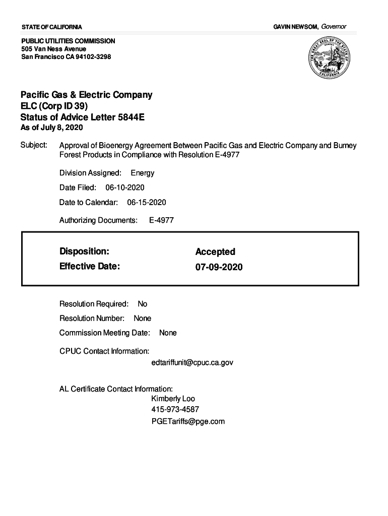GAVIN NEWSOM, Governorate OF CALIFORNIAPUBLIC UTILITIES COMMISSION 505 Van Less Avenue San Francisco CA 941023298Pacific Gas & Electric Company ETC (Corp ID 39) Status of Advice Letter 5844E As of