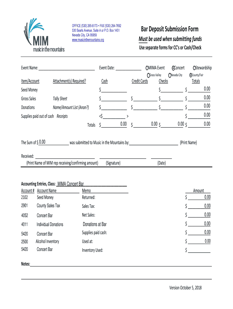 OFFICE (530) 2656173 FAX (530) 2647692 530 Seals Avenue, Suite A or P.O. Box 1451 Nevada City, CA 95959 www.musicinthemountains.orgBarDepositSubmissionForm Mustbeusedwhensubmittingfunds Use separate