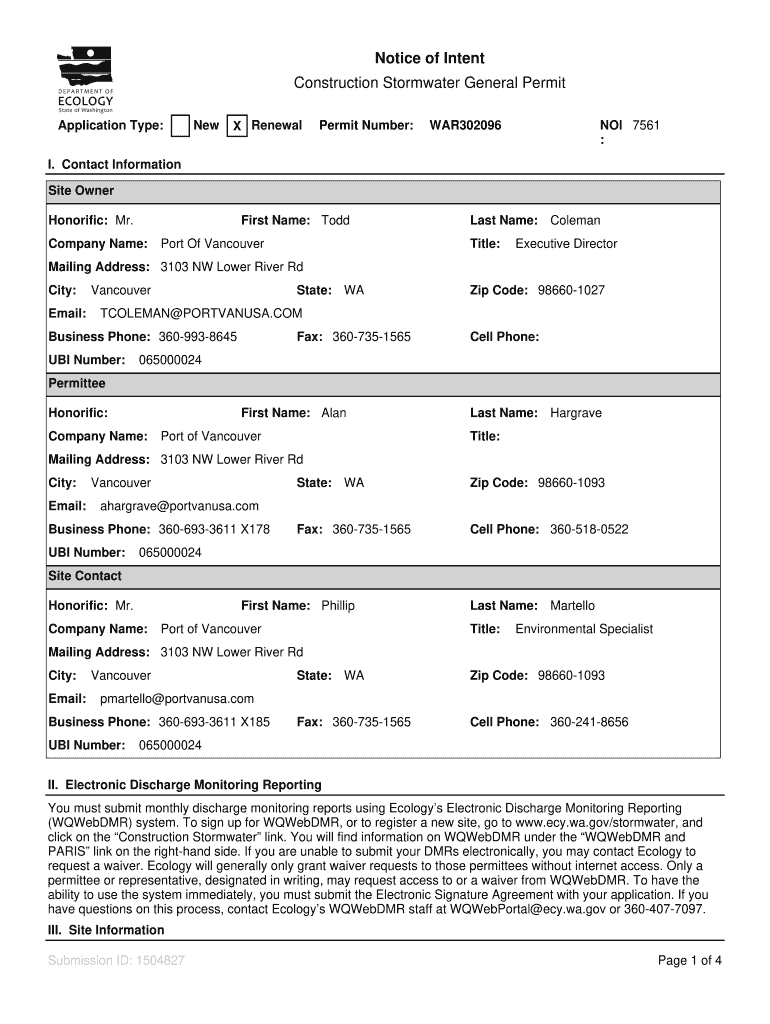 Application Type:New RenewalPermit Number:WAR302096NOI 7561