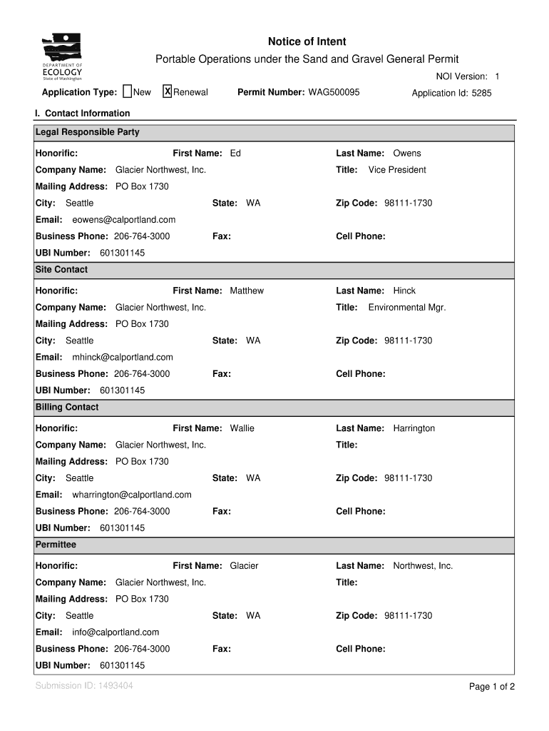 Application Type:New RenewalPermit Number: WAG500095Application I'd: 5285I. Contact Information