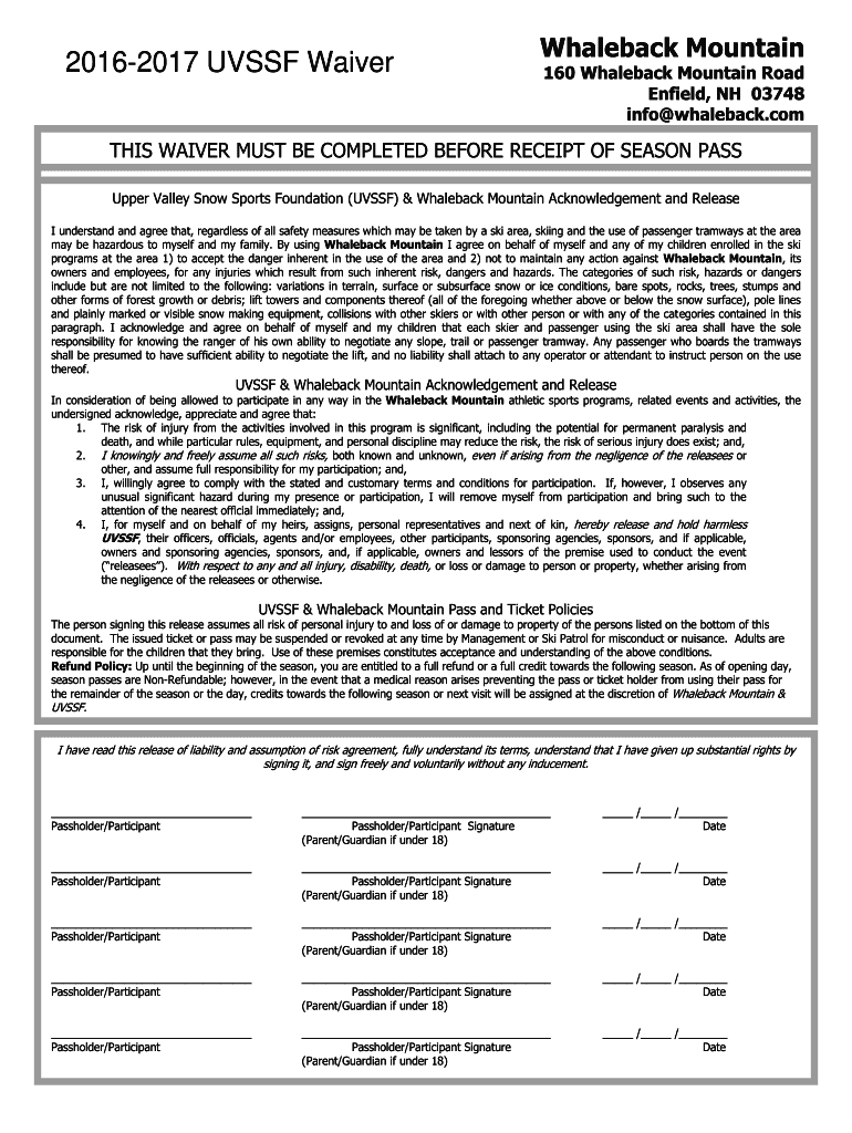20162017 UV SSF WaiverWhaleback Mountain160 Whale back Mountain Road Enfield, NH 03748 info whale back. This WAIVER MUST BE COMPLETED BEFORE RECEIPT OF SEASON PASS Upper Valley Snow Sports Foundation