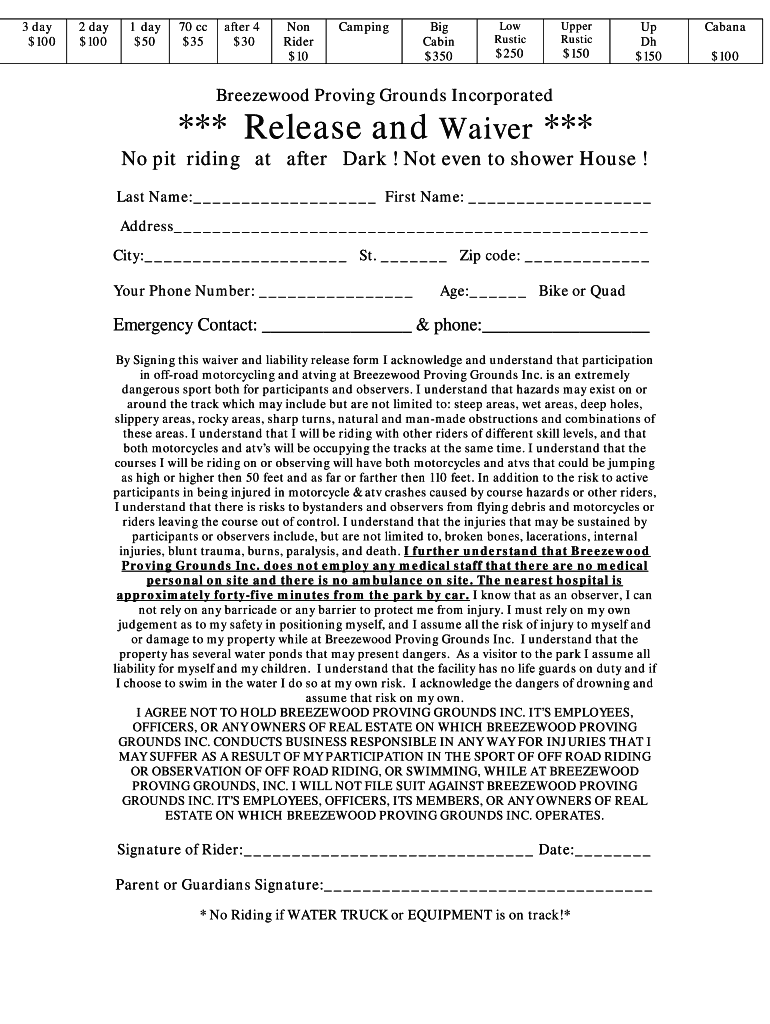 3 day $1002 day $1001 day $5070 cc $35after $430Non Rider $10CampingBig Cabin $350Low Rustic$250Upper Rustic$150Up DH $150Breezewood Proving Grounds Incorporated*** Release and Waiver ***No pit riding