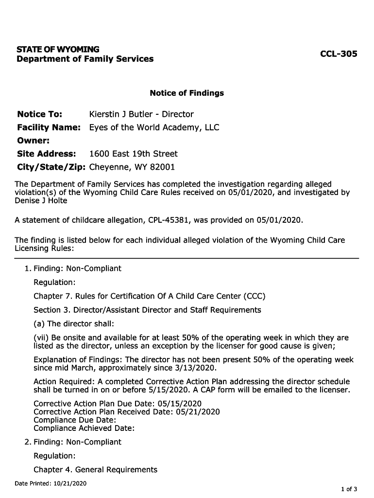 STATE OF WYOMING Department of Family ServicesCCL305Notice of FindingsNotice To:Kirstin J Butler DirectorFacility Name:Eyes of the World Academy, Lower: Site Address:1600 East 19th Streetcar/State/Zip: