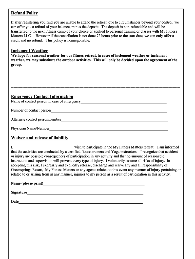 Anyone attending a fitness camp, whether as a participant, volunteer, or staff member, will typically be required to fill out a fitness camp liability form.
