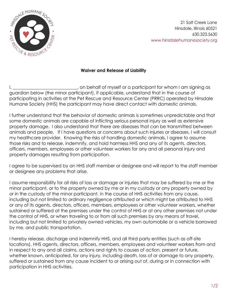 21 Salt Creek Lane Hillsdale, Illinois 60521 630.323.5630 www.hinsdalehumanesociety.orgWaiver and Release of Liability I, on behalf of myself or a participant for whom I am signing as guardian below