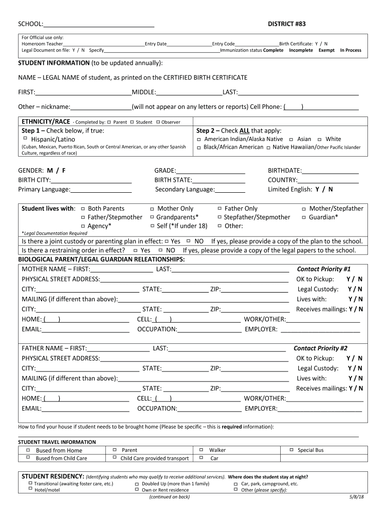 SCHOOL:DISTRICT #83For Official use only: Homeroom Teacher Legal Document on file: Y / N SpecifyEntry Carpentry Code Birth Certificate: Y / N Immunization status Complete Incomplete Exemption ProcessSTUDENT