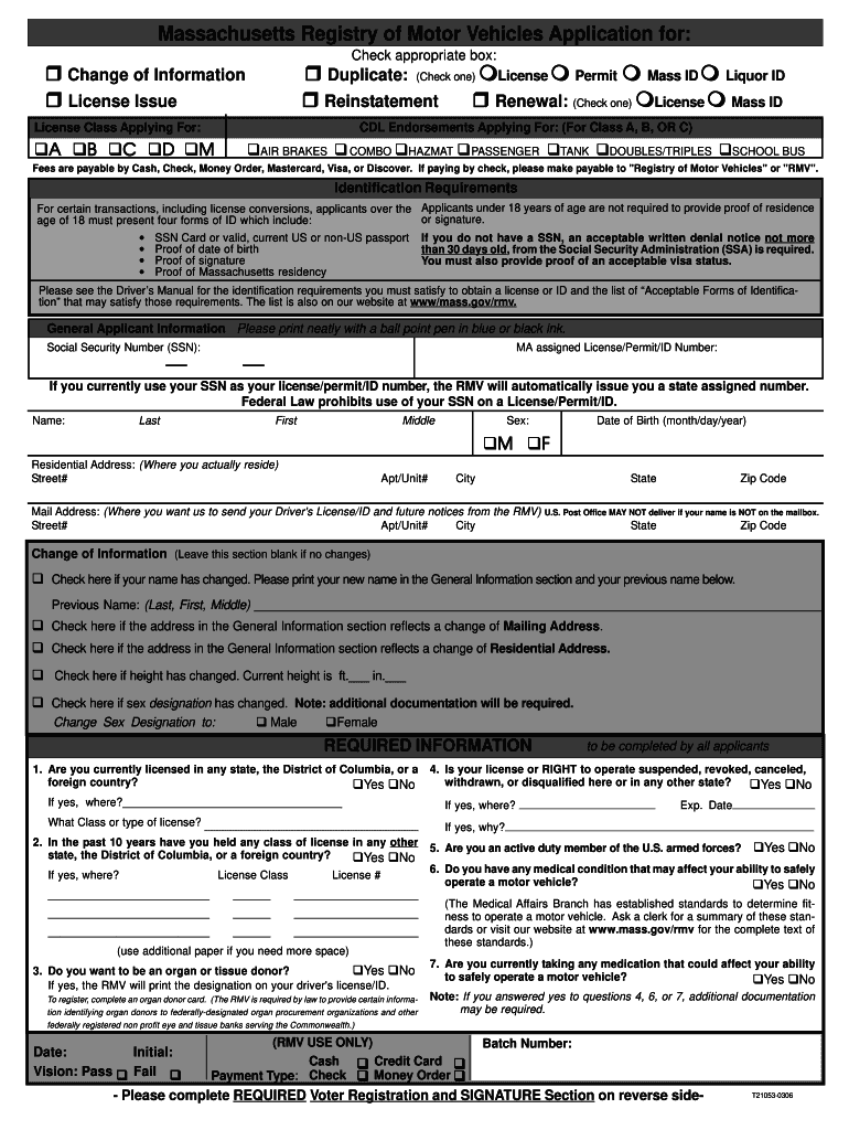 Massachusetts Registry of Motor Vehicles Application for: