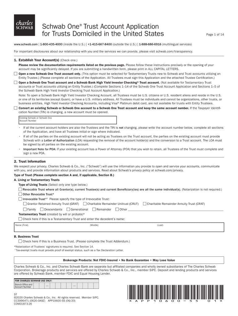 Instructions to Open or Update a Schwab One Trust Account with Optional Schwab Bank High Yield Investor Checking Account www.schwab.com 18004354000 (inside the U.S.) +14156678400 (outside the U.S.)