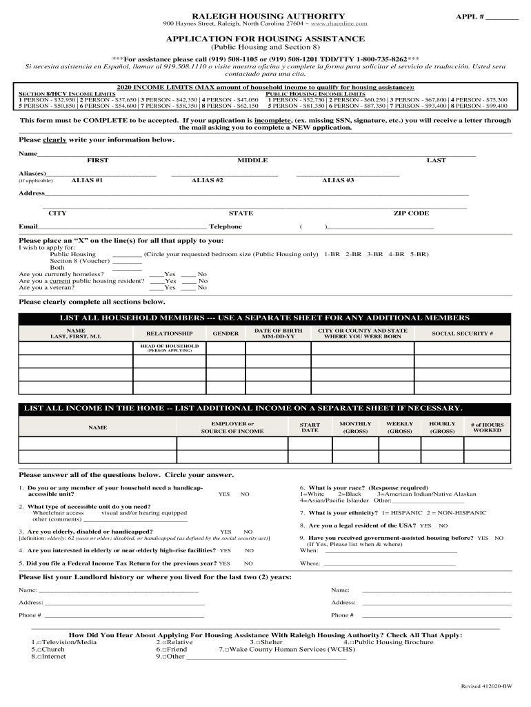 RALEIGH HOUSING AUTHORITYAPPL # 900 Haynes Street, Raleigh, North Carolina 27604 www.rhaonline.comAPPLICATION FOR HOUSING ASSISTANCE (Public Housing and Section 8) ***For assistance please call (919)