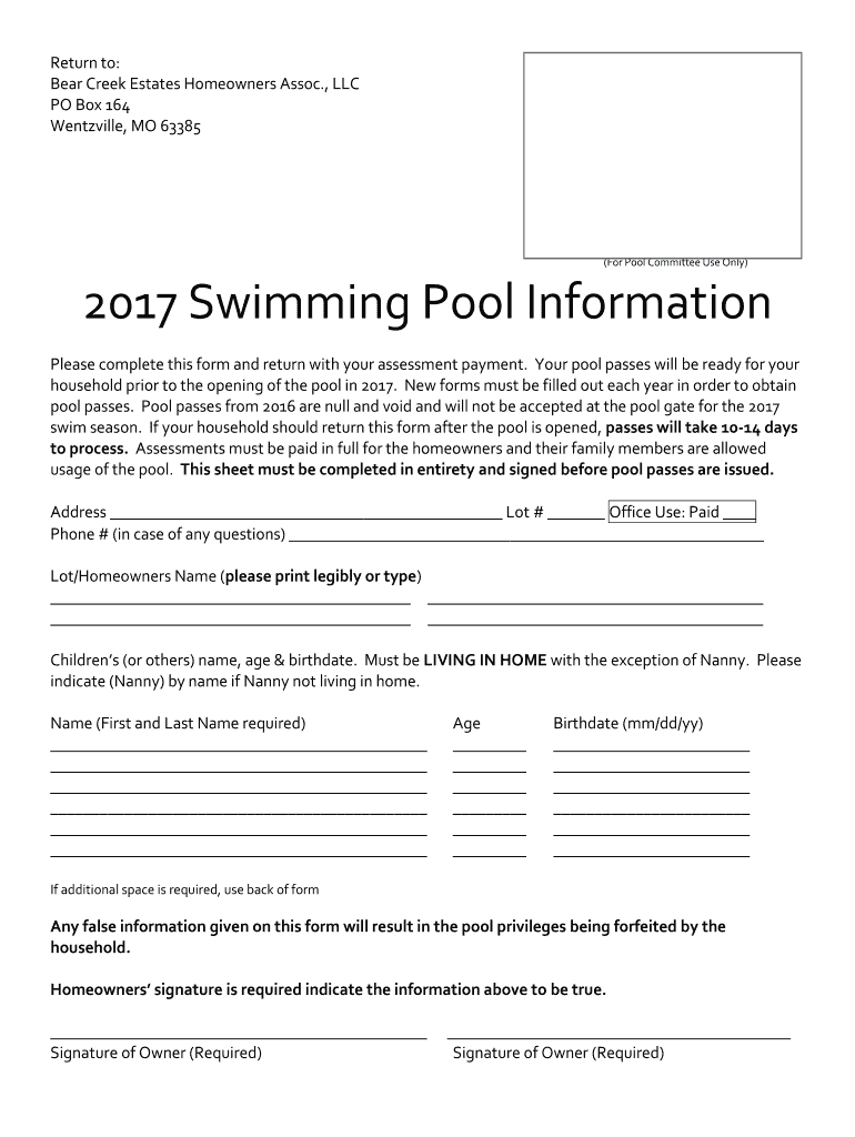 Wentzville, MO 63385(For Pool Committee Use Only)2017 Swimming Pool Information