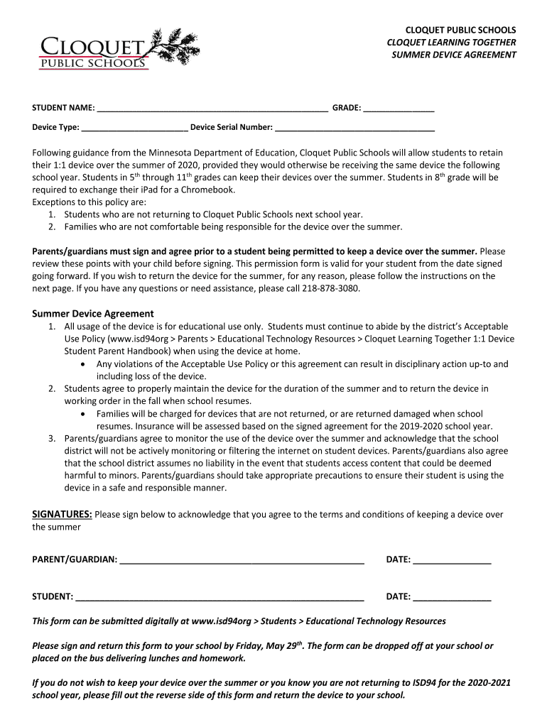 CROQUET PUBLIC SCHOOLS CROQUET LEARNING TOGETHER SUMMER DEVICE AGREEMENTSTUDENT NAME: GRADE: Device Type: Device Serial Number: Following guidance from the Minnesota Department of Education, Croquet