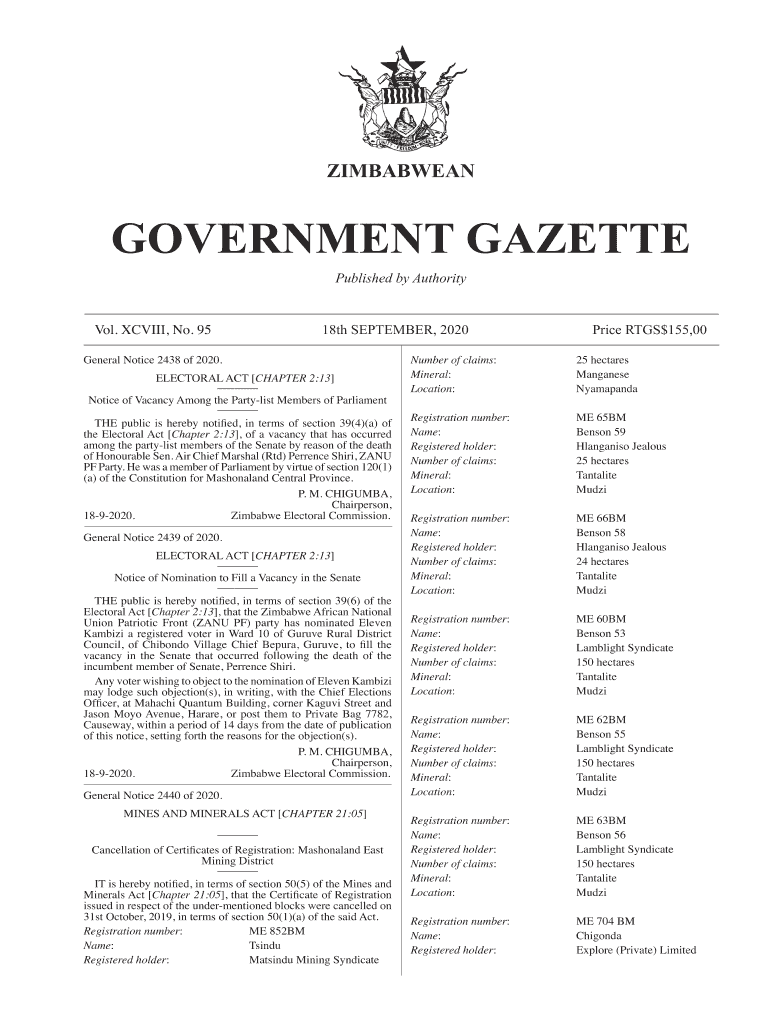 Zimbabwean Government Gazette, 18th September, 20202359ZIMBABWEANGOVERNMENT GAZETTE Published by Authority. XCVII, No. 9518th SEPTEMBER, 2020General Notice 2438 of 2020. Number of claims:Mineral:Location:ELECTORAL
