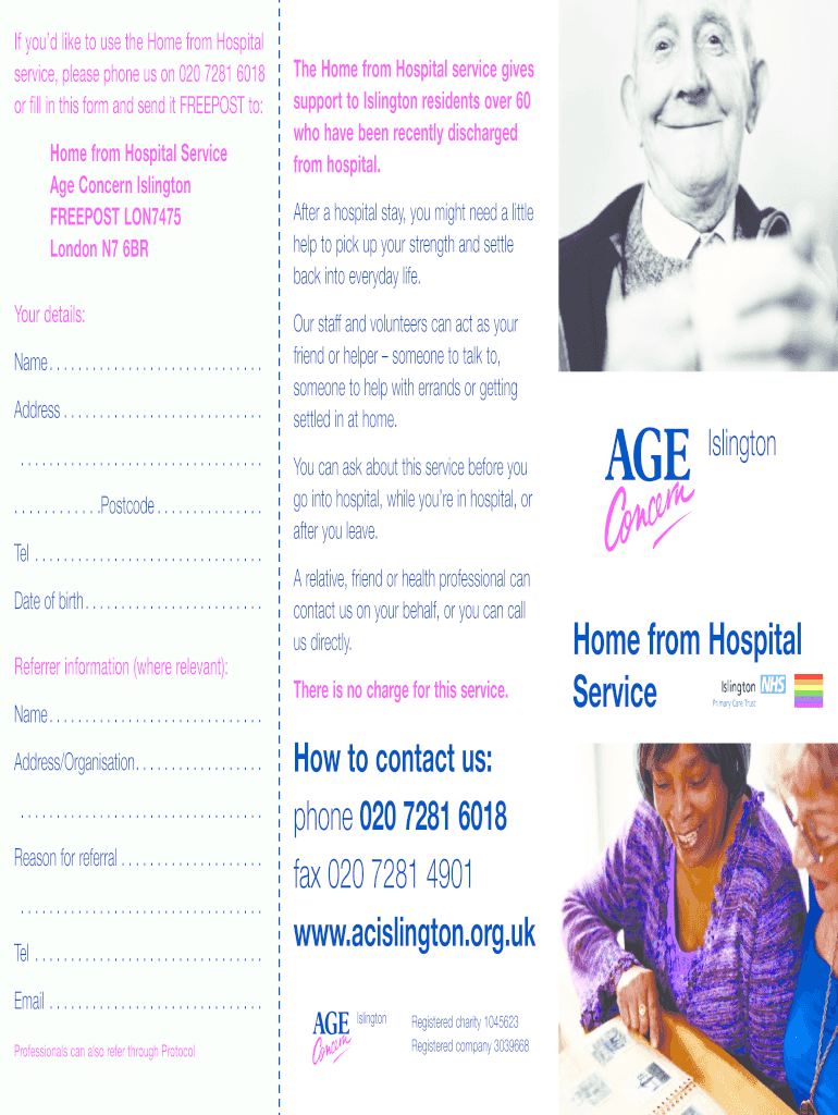 If you'd like to use the Home from Hospital service, please phone us on 020 7281 6018 or fill in this form and send it FREE POST to: Home from Hospital Service Age Concern Arlington FREE POST LON7475