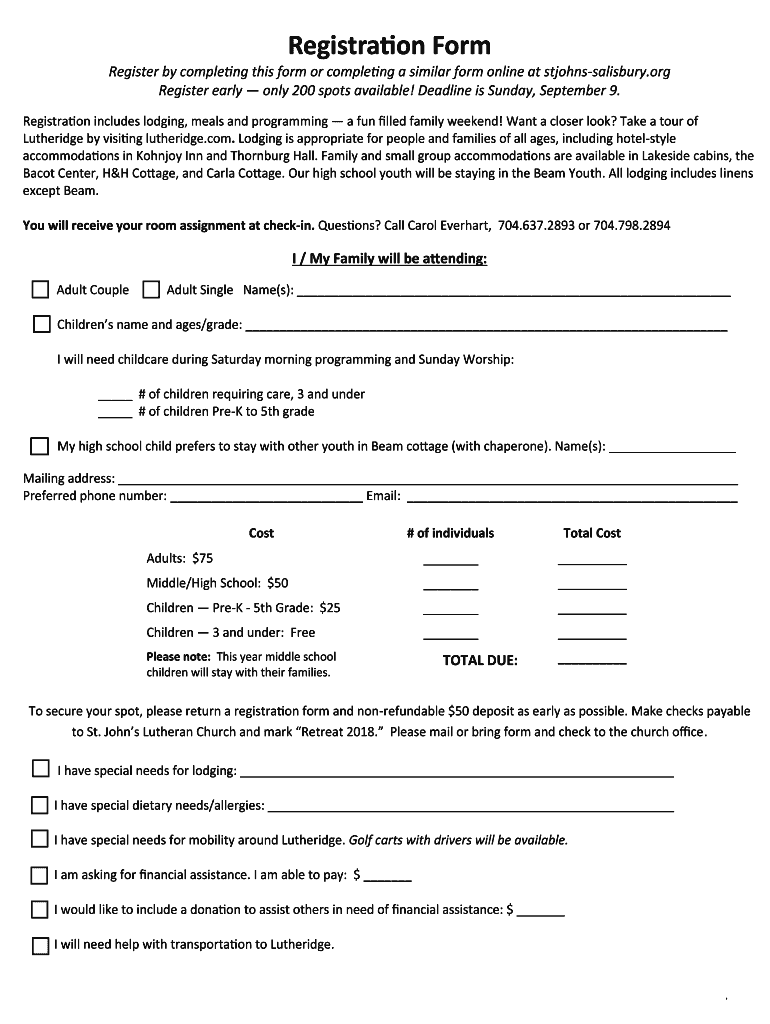 Registration Form Register by completing this form or completing a similar form online at stjohnssalisbury.org Register early only 200 spots available! Deadline is Sunday, September 9. Registration