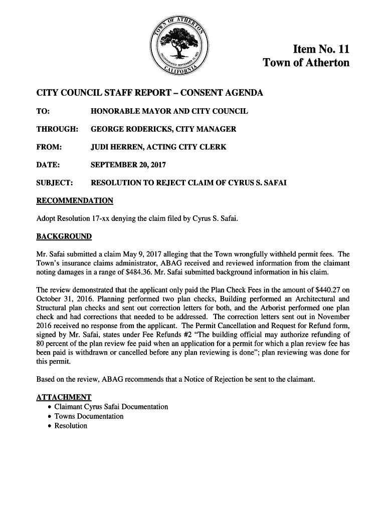 Item No. 11 Town of Atherton CITY COUNCIL STAFF REPORT CONSENT AGENDA TO:HONORABLE MAYOR AND CITY COUNCILTHROUGH:GEORGE RODERICK, CITY MANAGERFROM:AUDI HERE, ACTING CITY CHECKMATE:SEPTEMBER 20, 2017SUBJECT:RESOLUTION
