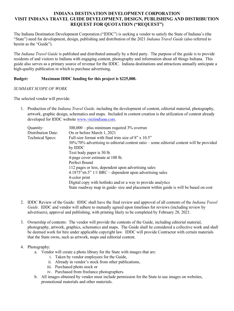 VISIT INDIANA TRAVEL GUIDE DEVELOPMENT, DESIGN, PUBLISHING AND DISTRIBUTION