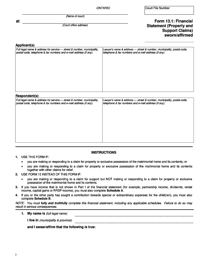ONTARIOCourt File Number(Name of court)form 13.1: Financial Statement (Property and Support Claims) sworn/affirmed(Court office address)Applicant(s) Full legal name & address for service street &