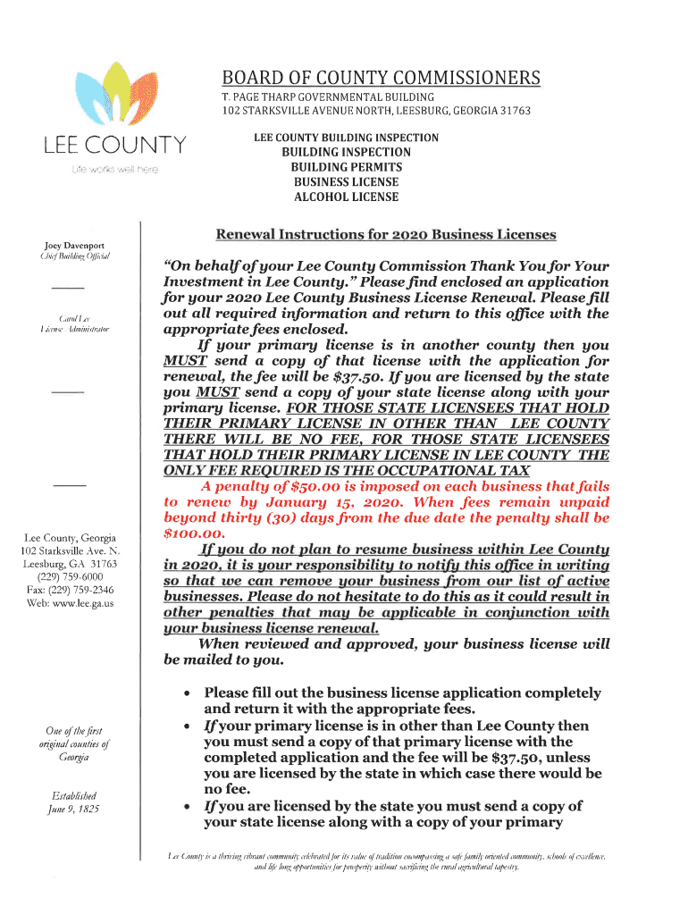OCCUPATIONAL, ADMINISTRATION & REGULATORY FEES LEE COUNTY, GA Name of business: County Mailing address: City State Zip Business Location: Phone number: Email: Name of person (s), or principal (s),