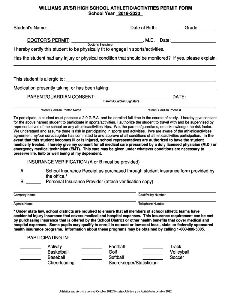WILLIAMS JR/SR HIGH SCHOOL ATHLETIC/ACTIVITIES PERMIT FORM School Year 20192020 Students Name:Date of Birth:DOCTOR IS PERMIT:, M.D. Grade: Date:Doctors Signature hereby certify this student to be