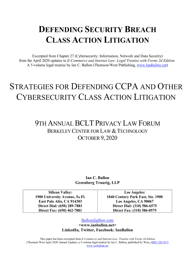 DEFENDING SECURITY BREACH CLASS ACTION LITIGATION Excerpted from Chapter 27 (Cybersecurity: Information, Network and Data Security) from the April 2020 updates to e-commerce and Internet Law: Legal