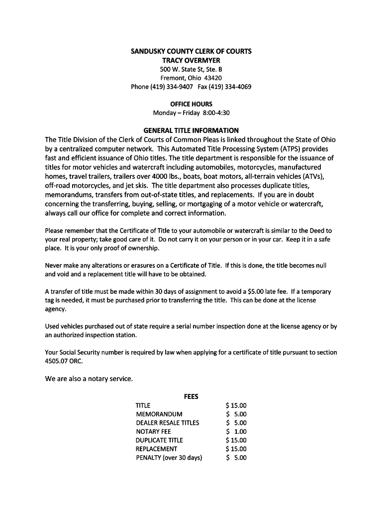 SANDUSKY COUNTY CLERK OF COURTS TRACY OVERSEER 500 W. State St, Ste. B Fremont, Ohio 43420 Phone (419) 3349407 Fax (419) 3344069 OFFICE HOURS Monday Friday 8:004:30GENERAL TITLE INFORMATION The Title