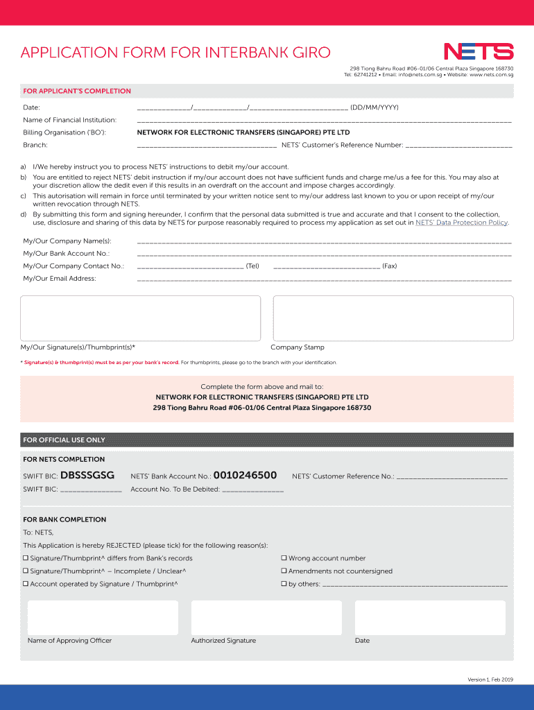 APPLICATION FORM FOR INTERBANK GIRO 298 Ting Bar Road #0601/06 Central Plaza Singapore 168730 Tel: 62741212 Email: info nets.com.SG Website: www.nets.com.sgFOR APPLICANTS COMPLETION Date: / / (DD/MM/YYY)Name