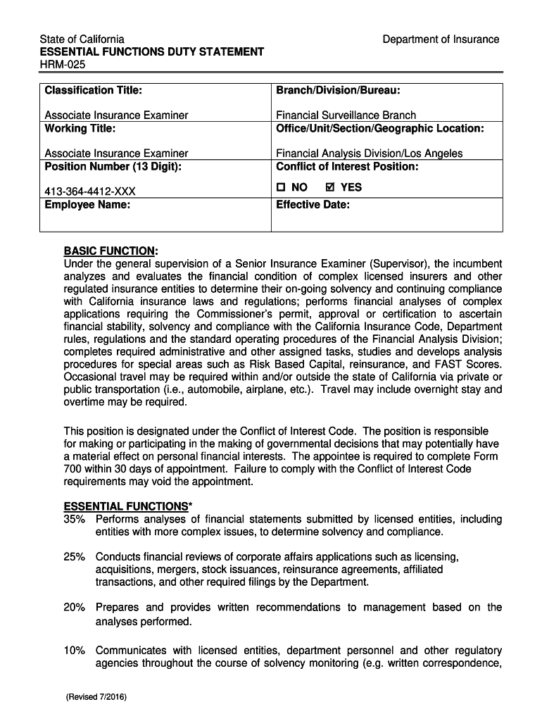 HRM025Department of InsuranceClassification Title:Branch/Division/Bureau:Associate Insurance Examiner