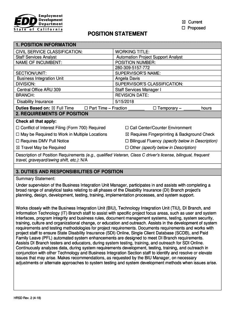 Current ProposedPOSITION STATEMENT 1. POSITION INFORMATION CIVIL SERVICE CLASSIFICATION: Staff Services Analyst NAME OF INCUMBENT: SECTION/UNIT: Business Integration Unit DIVISION: Central Office