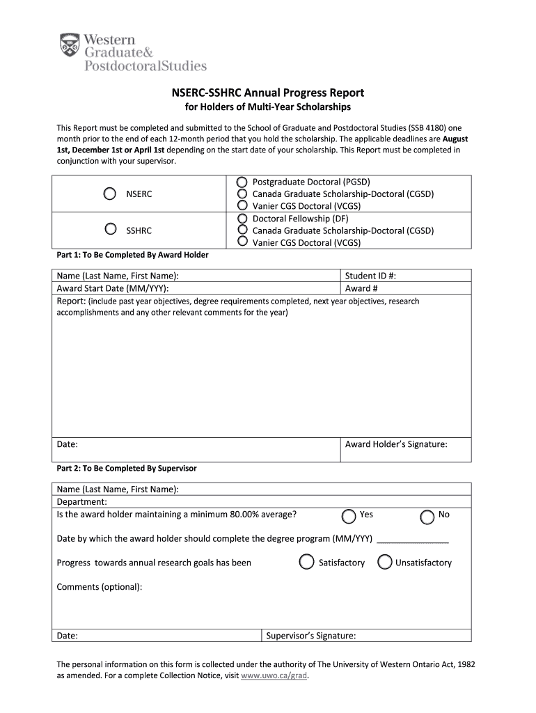 The NSERC-SSHRC Annual Progress Report is a vital document for postgraduate students in Canada, specifically those involved in doctoral research. This report serves to communicate the students’ academic developments to the School of Graduate and Postdoctoral Studies, ensuring that both students and supervisors are aligned regarding academic progress.