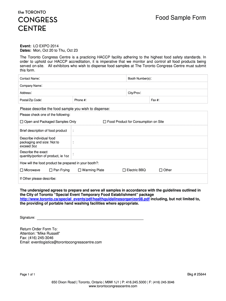 Food Sample Form Event: LO EXPO 2014 Dates: Mon, Oct 20 to Thu, Oct 23 The Toronto Congress Center is a practicing HACCP facility adhering to the highest food safety standards. In order to uphold