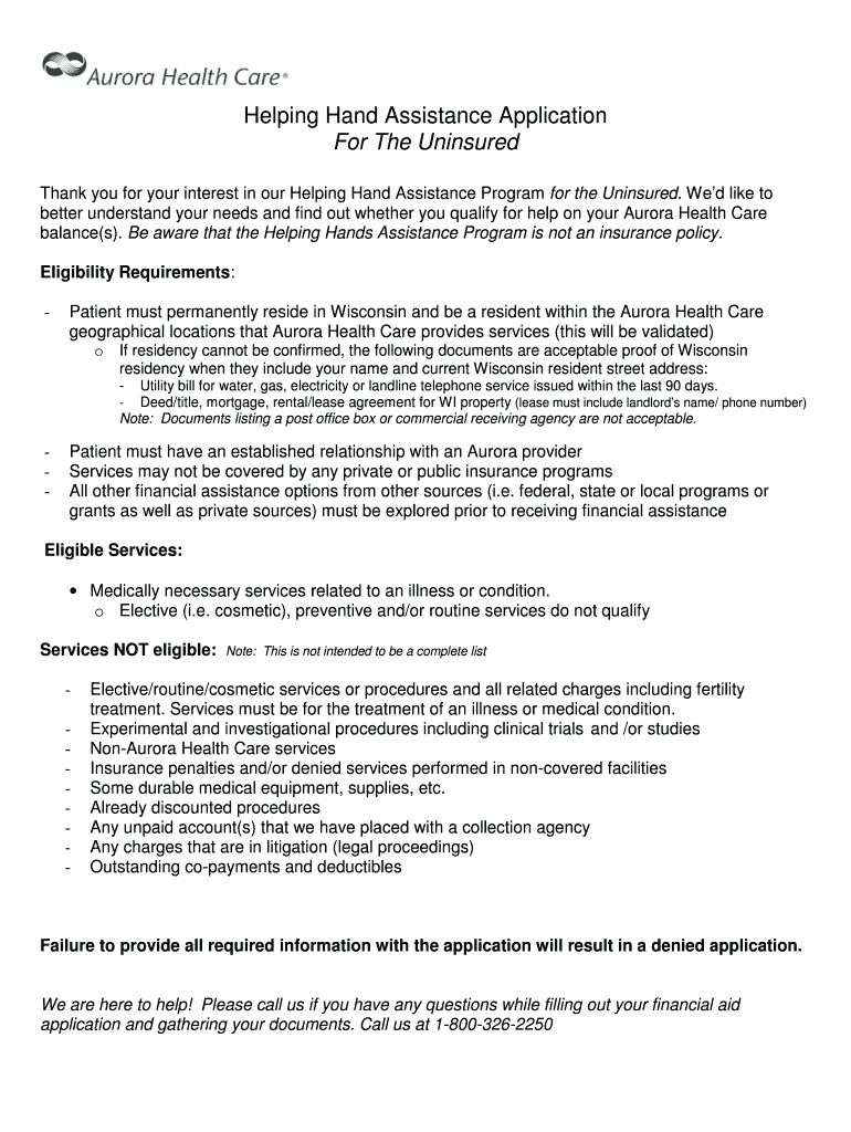 The Helping Hand Assistance Application is a healthcare form used by uninsured individuals in Wisconsin to apply for financial assistance from Aurora Health Care.
