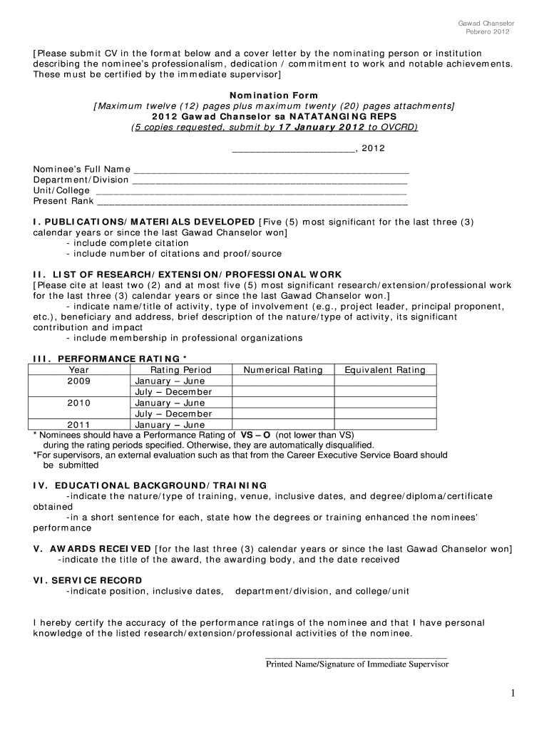 Gawd Chancellor Herero 2012 Please submit CV in the format below and a cover letter by the nominating person or institution describing the nominee s professionalism, dedication / commitment to work