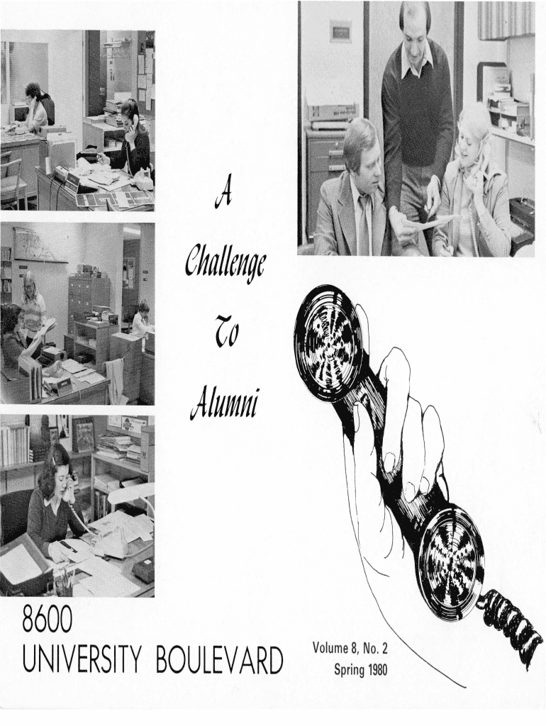 Challenge:o Alumni8600 UNIVERSITY BOULEVARDVolume 8, No. 2 Spring 1980On the cover. . . Volunteers from the Alumni Association took to the telephone the week of March 1725 to raise funds for projects