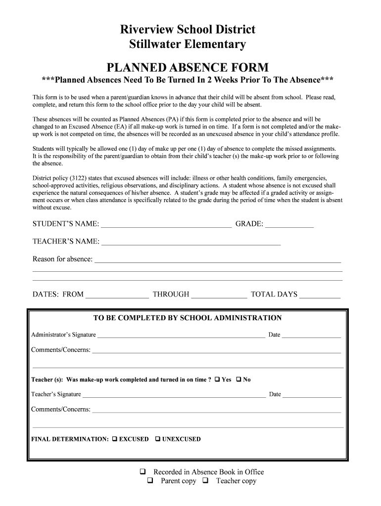 The Planned Absence Form is a crucial document used within the Riverview School District to inform the school about student absences in advance. This form allows parents or guardians to formally notify the school regarding their child's upcoming planned absence, ensuring proper records are maintained.