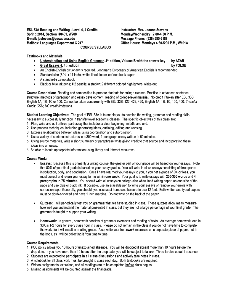 Get the free ESL 33A Spring 2014 Syllabus - Pasadena City College - pasadena