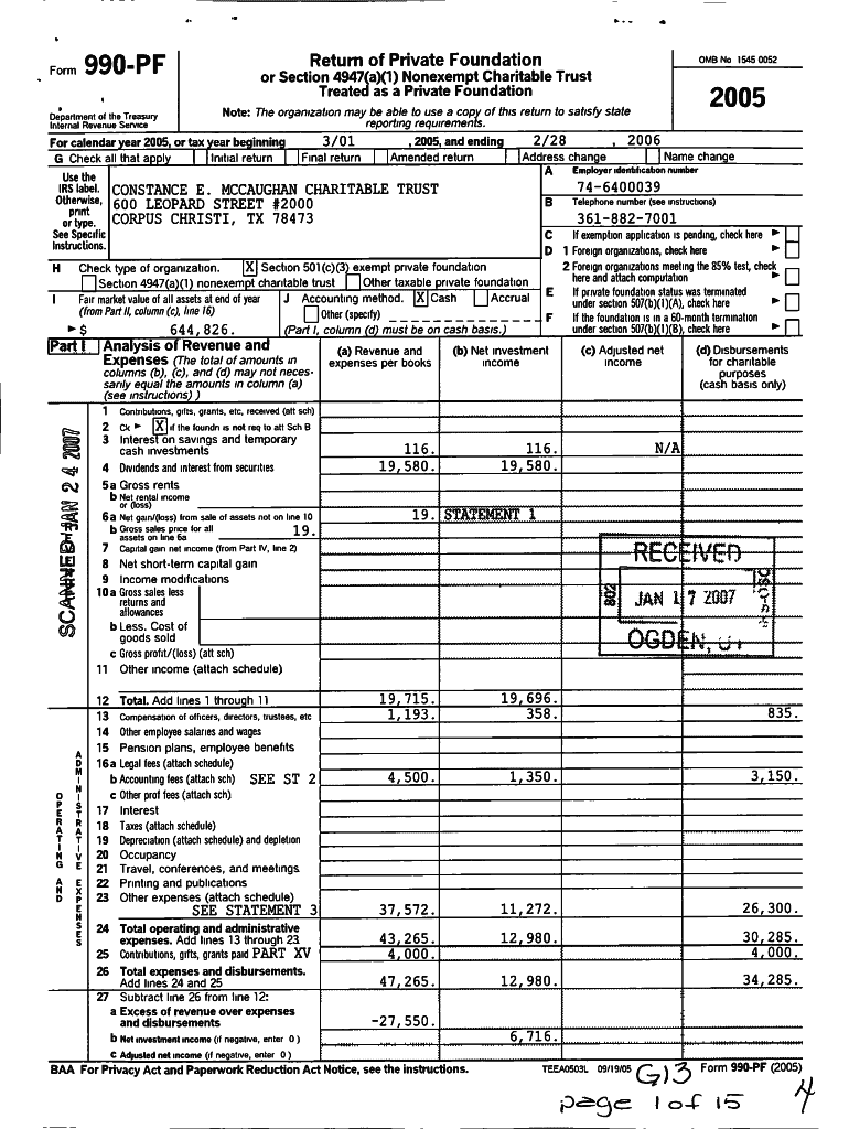 Return of Private Foundation990 P Former Section 4947(a)(1) Nonexempt Charitable Trust Treated as a Private Foundation calendar year 2005, or tax year beg inning Check all that godly Initial return3/U1