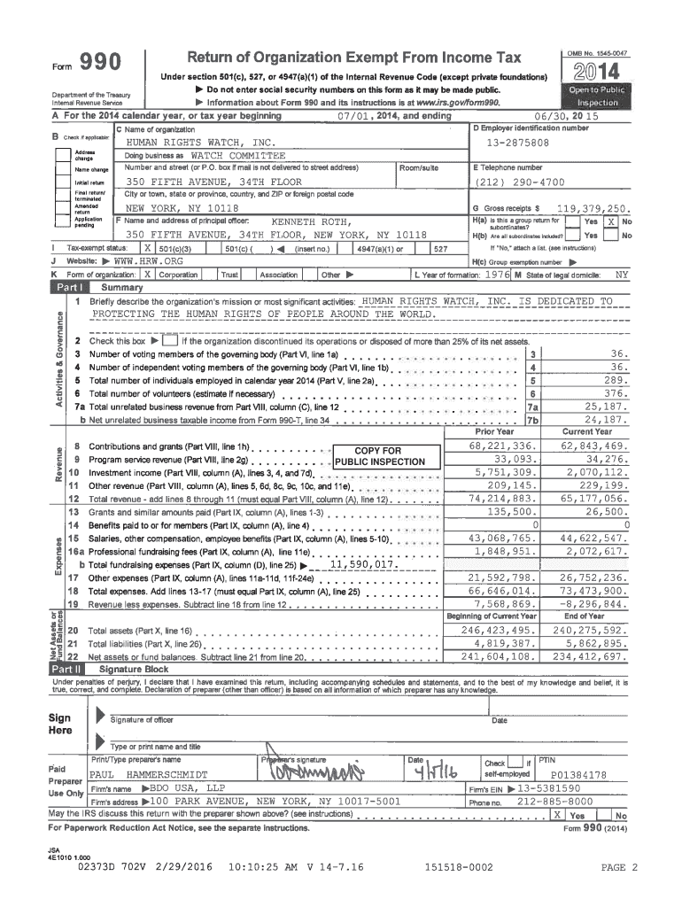 ACCURATE TAX RETURN IS NOT YET AVAILABLE FROM THIRD PARTIES.HUMAN RIGHTS WATCH, INC.132875808Form 990 (2014)Pageant III
