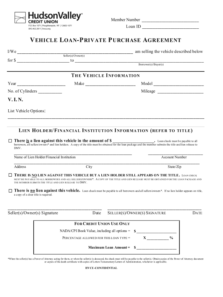 Member Number Loan ID P.O. Box 1071 Poughkeepsie, NY 126021071 845.463.3011 HBCU.org VEHICLE L OAN PRIVATE P PURCHASE AGREEMENT I/We are selling the vehicle described below Seller(s)/Owner(s)for $