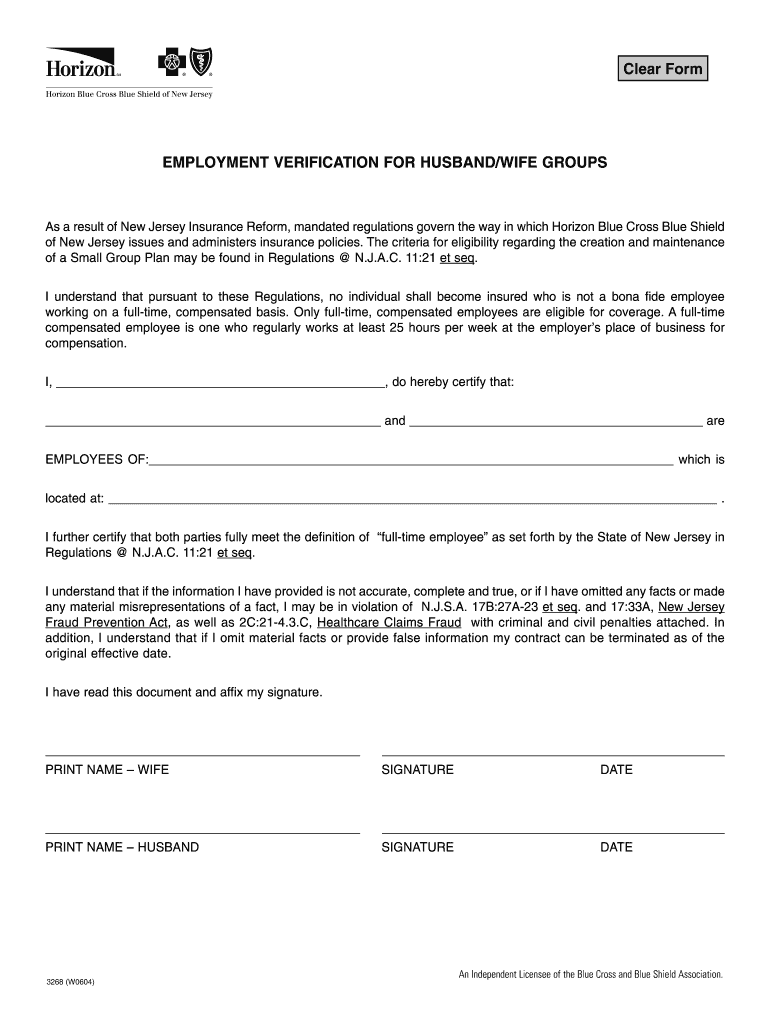 Clear Form EMPLOYMENT VERIFICATION FOR HUSBAND/WIFE GROUPS As a result of New Jersey Insurance Reform, mandated regulations govern the way in which Horizon Blue Cross Blue Shield of New Jersey issues