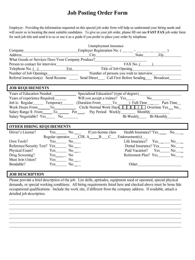 By utilizing the job posting order form, employers can provide recruitment services with comprehensive details, which enhances the overall efficiency of the job placement process. This can significantly improve the chances of finding the right candidates for employment.