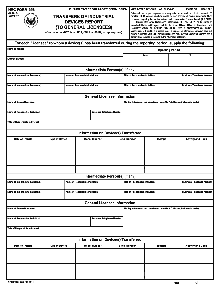 NRC Form 653 is a reporting document used by the Nuclear Regulatory Commission (NRC) for the reporting of material and events related to the use of certain radioactive materials.