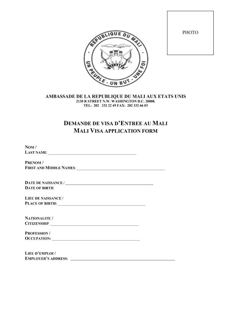 PHOTOAMBASSADE DE LA REPUBLICAN DU MALI AUX EATS UNIS 2130 R STREET N.W. WASHINGTON D.C. 20008. TEL: 202 332 22 49 FAX: 202 332 66 03DEMANDE DE VISA Entrée AU MALI VISA APPLICATION FORM NOT / LAST