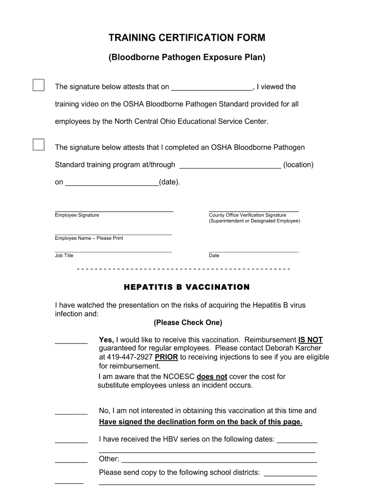 TRAINING CERTIFICATION FORM (Blood-borne Pathogen Exposure Plan) The signature below attests that on, I viewed the training video on the OSHA Blood-borne Pathogen Standard provided for all employees