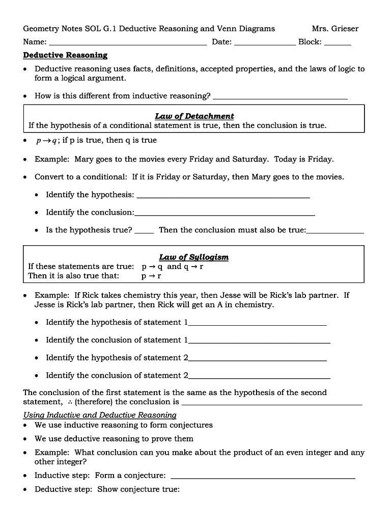 Geometry Notes SOL G.1 Deductive Reasoning and Venn Diagrams Mrs. GrieserName: Date: Block: Deductive Reasoning uses facts, definitions, accepted properties, and the laws of logic to form a logical