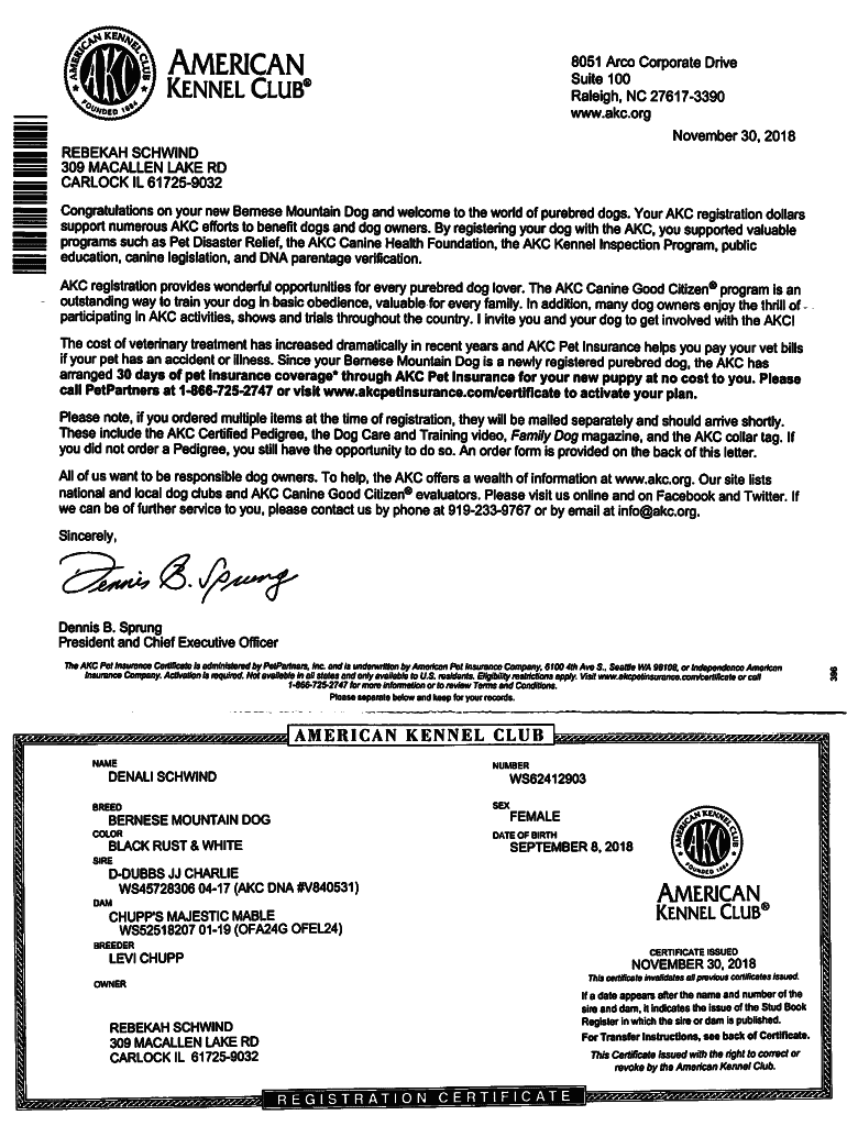 Keep the registration certificate safe as proof of your dog's pedigree and AKC registration.