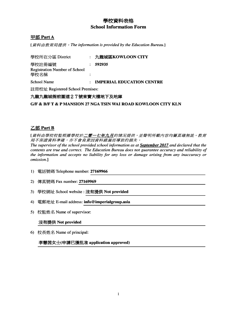 School Information Form Part A The information is provided by the Education Bureau. District:KOWLOON CITY Registration Number of School :592935School Name:: IMPERIAL EDUCATION Center Registered School