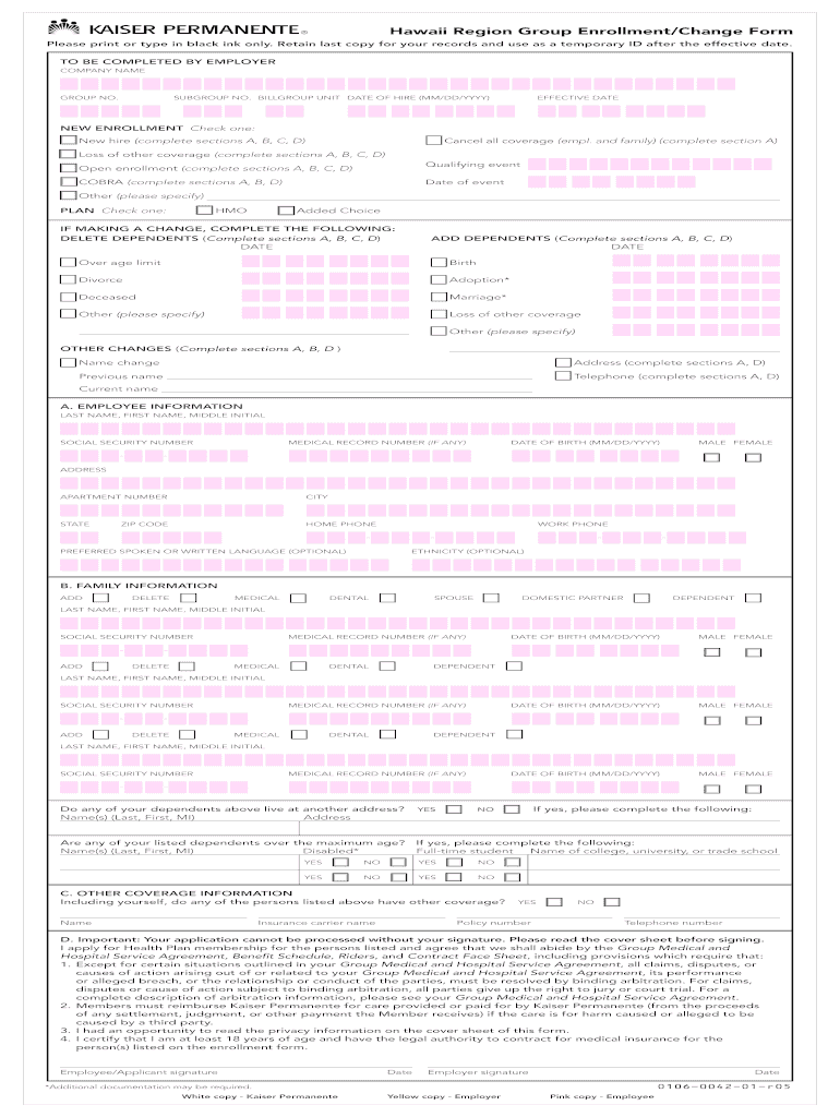 The Hawaii Group Enrollment/Change Form is a health insurance enrollment document used by employees and employers in Hawaii to enroll in, change, or cancel insurance coverage through Kaiser Permanente.